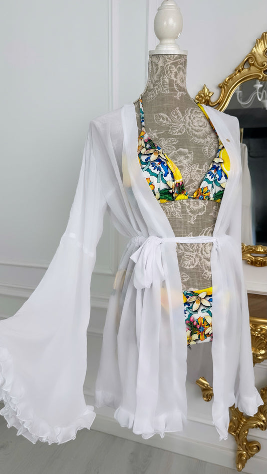 Cardigan Voal " Fantasia " - SCURT - ALBCardiganul "Fantasia" este creat pentru a fi purtat atât la plajă ori la piscină, peste costumul de baie favorit, cât și în zona privată a casei, atunci când îți dorești să te simți sublimă , elegantă dar și senzuală în același timp. Promitem că te vei simți unică îmbrăcând această...